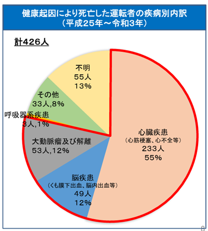 平成25年から令和3年までの9年間で、健康起因事故を起こした計2,465人の疾病統計を見ると、心臓疾患、脳疾患、大動脈瘤及び解離の合計が32%となっています。このうち、死亡した運転者の疾病で見ると、心臓疾患が55%、脳疾患が12%、大動脈瘤及び解離が12%です。これらの疾病の根本には、生活習慣病があると言われています。