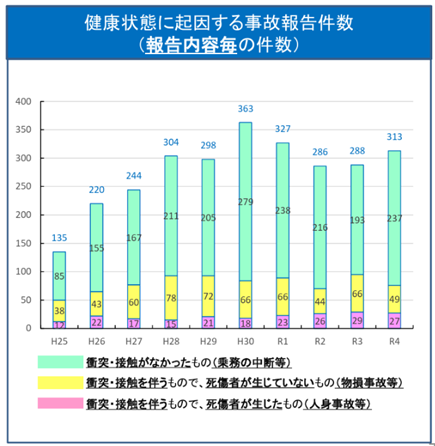 統計としては、事業用自動車、いわゆるトラックやバス、タクシーの運転者における健康起因事故件数が発表されているのですが、それによると、年間約300件もの事故が発生しています。事業用自動車だけで、この件数ですから、一般車両も数に入れるとさらに多くの事故が起こっていると思われます。